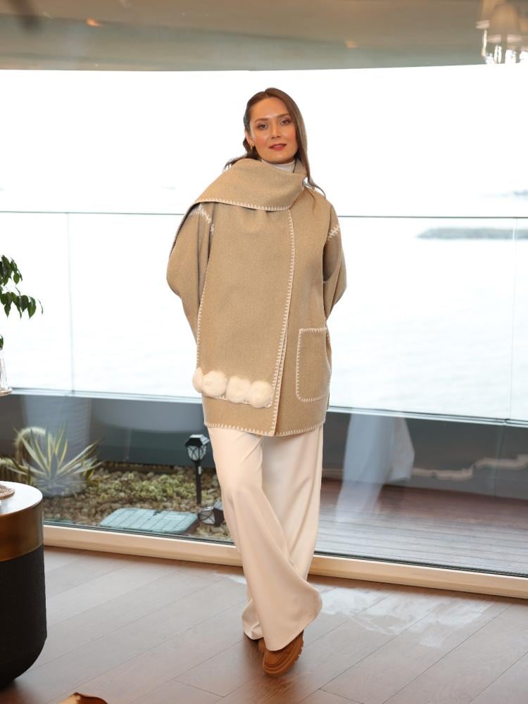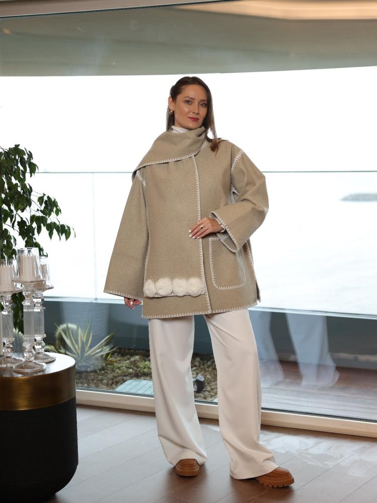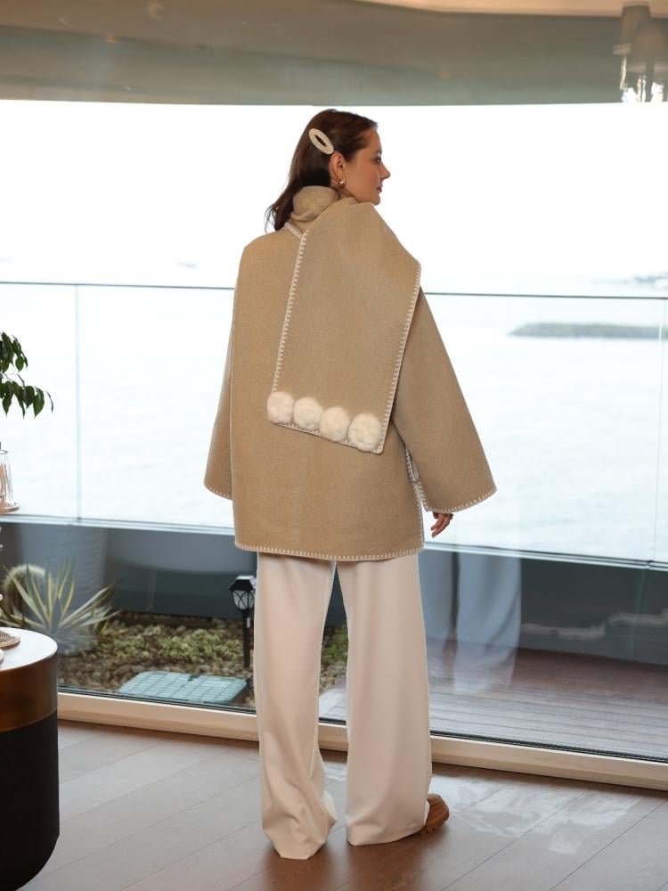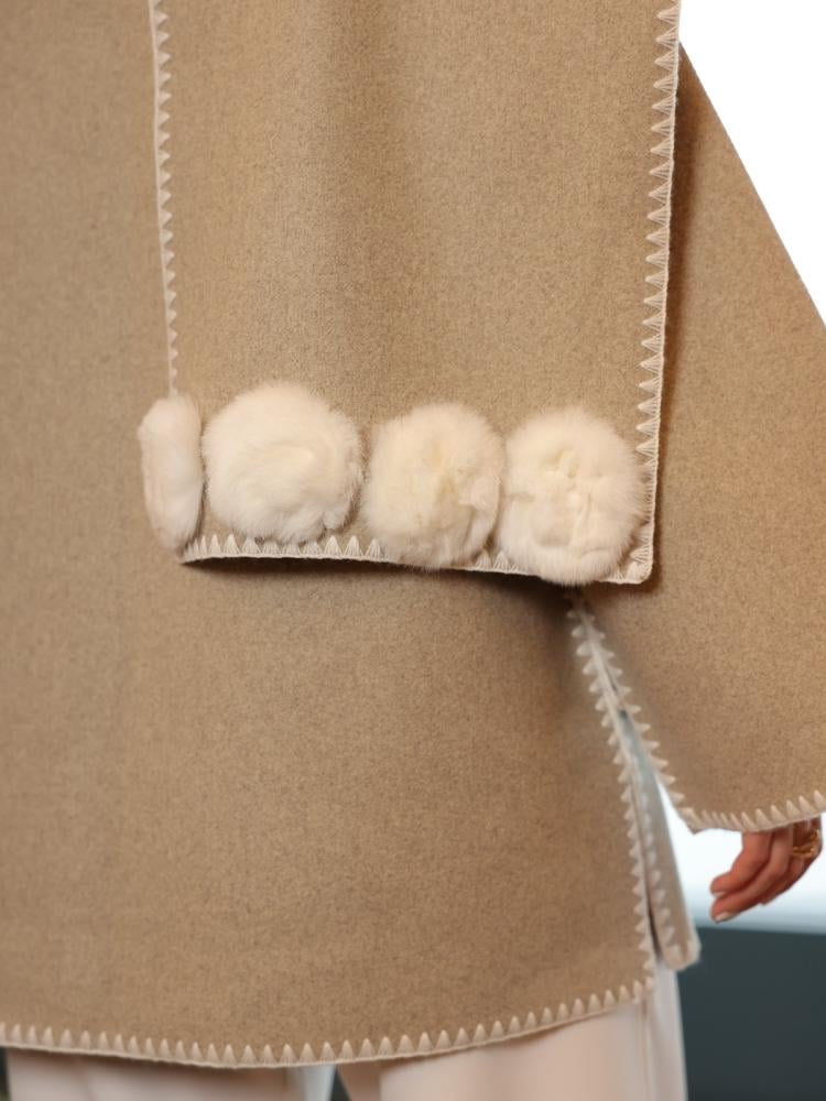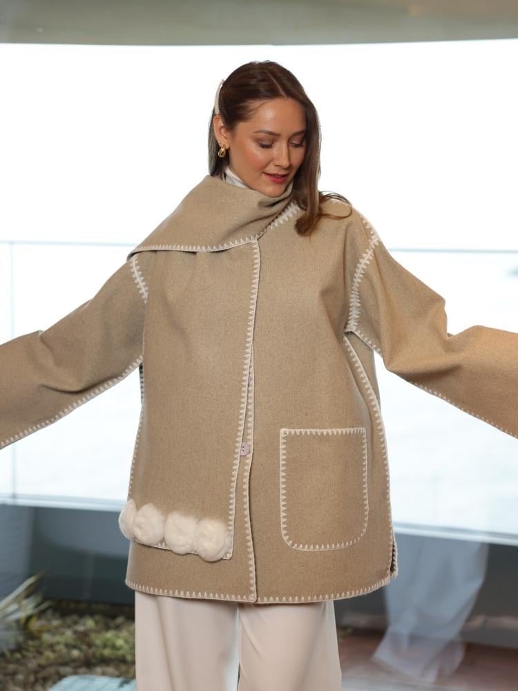 يتميز بوجود الشال اللذي يحتوي على فرو الريكس الطبيعي و الاكمام الواسعه و الانيقه ..