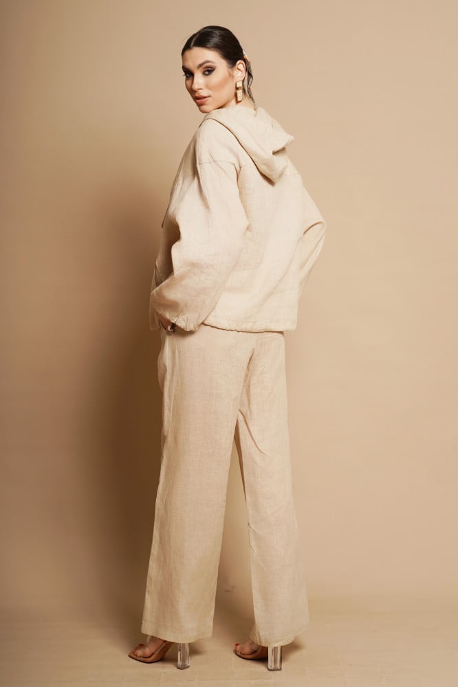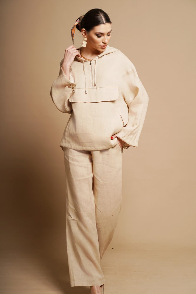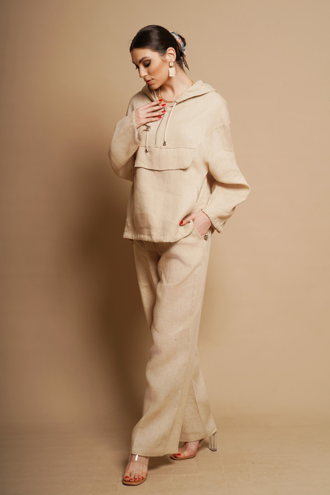 طقم روزا مصنوع من قماش اللينن الخفيف بأكمام كاملة و واسعه و قبعه و بنطلون بمغاط مريح جداً ستكون هذه القطعة عمليه ومريحه للسفر والاستراحات والاماكن الحاره لأن قماشها ماص وقابل للتنفس بشكل ممتاز . اجعلي مظهرك انيق وراقي و مريح غير متكلف ..