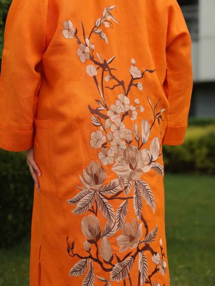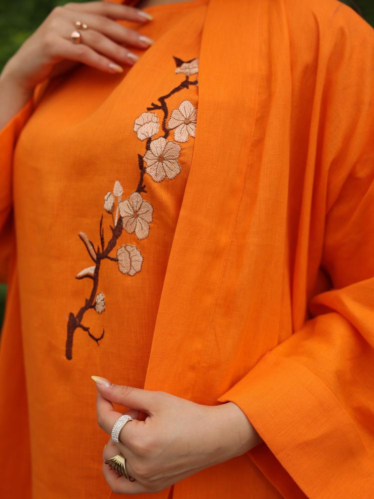تصميم الطقم واسع، فضفاض، ومطرّز بنقوش زهرية ناعمة تمتد على شكل غصن بانسيابية أنثوية تعبّر عن الطبيعة والهدوء.