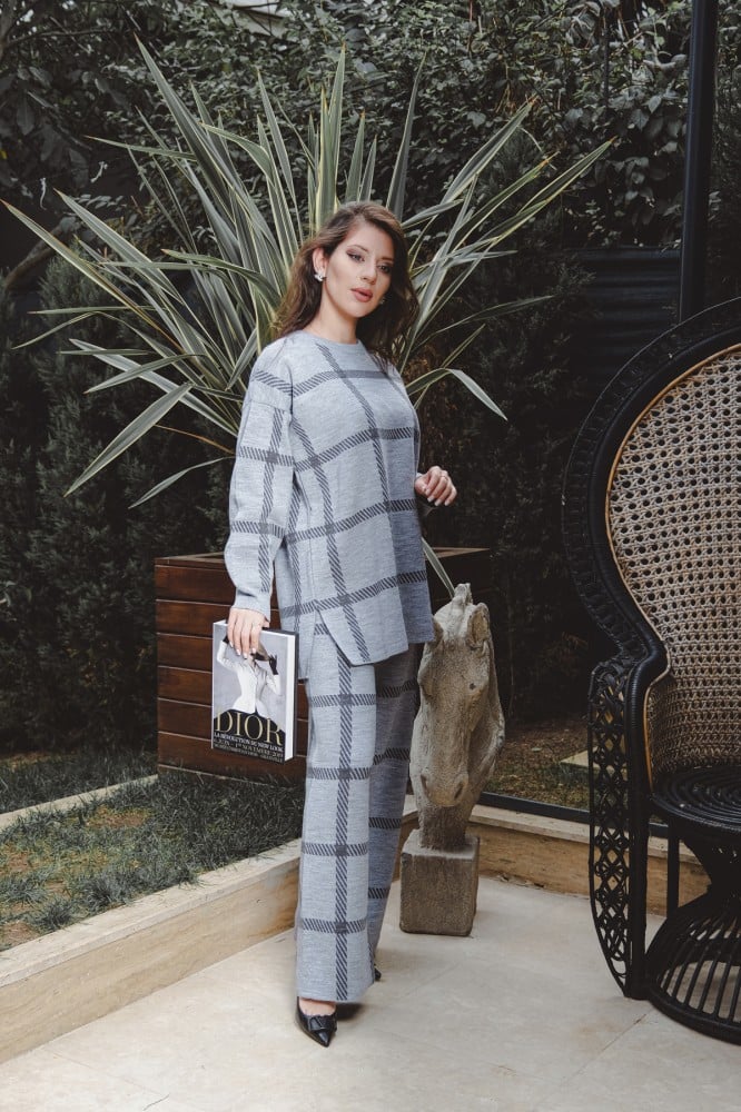 طقم مصنوع من الصوف الدافئ مكون من قطعتين .. بمربعات انيقه .