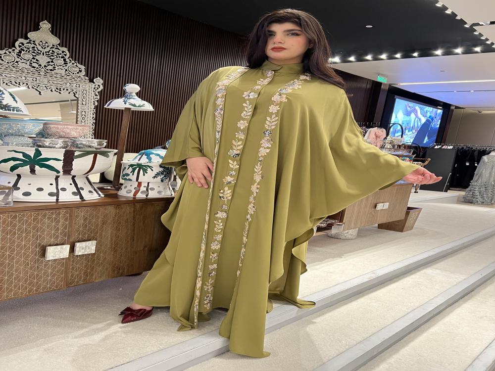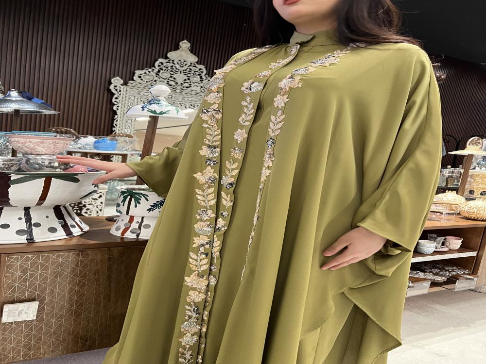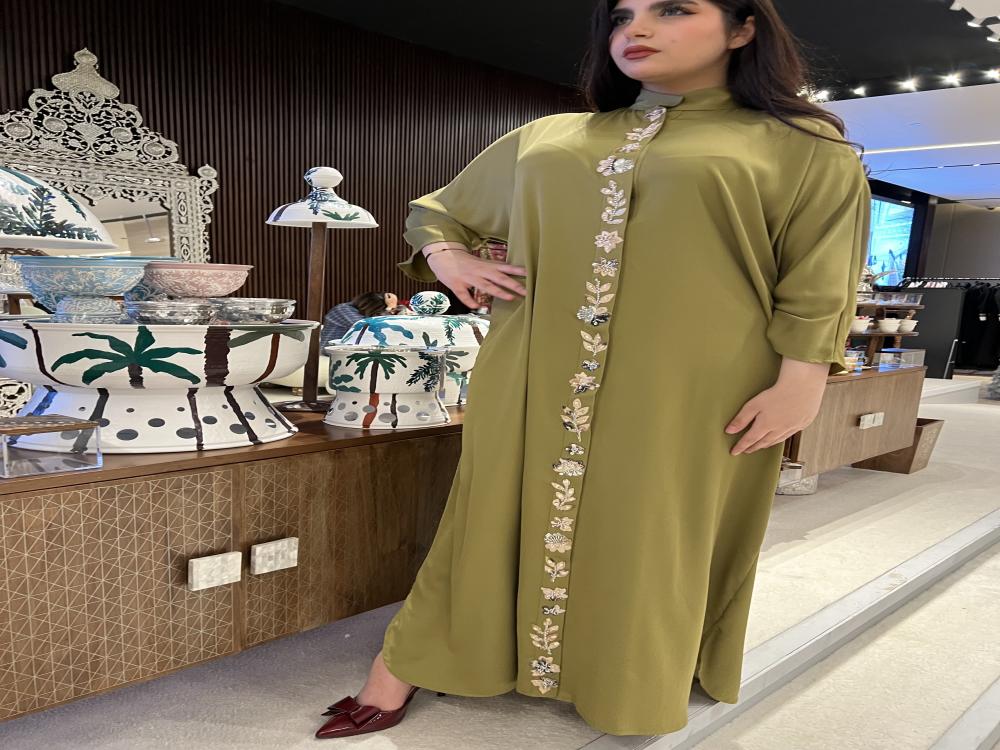 فستان فاخر بلون زيتي عصري مكون من قطعتين أنيقتين بخامة حرير ناعمة وانسيابية تمنحك إحساسًا بالراحة والرقي. يتميز بتطريز زهور ناعم بلون بيج وذهبي ممتد على كامل التصميم، يضفي لمسة أنثوية وراقية.